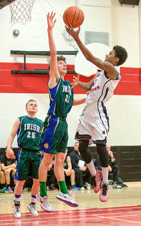 Northern Collegiate’s Jaden Ogorek, right, goes up for a shot against defender Stefan Mallozzi of St. Patrick’s High during the LKSSAA AAA Junior Boys Basketball Championship final played on Feb.…