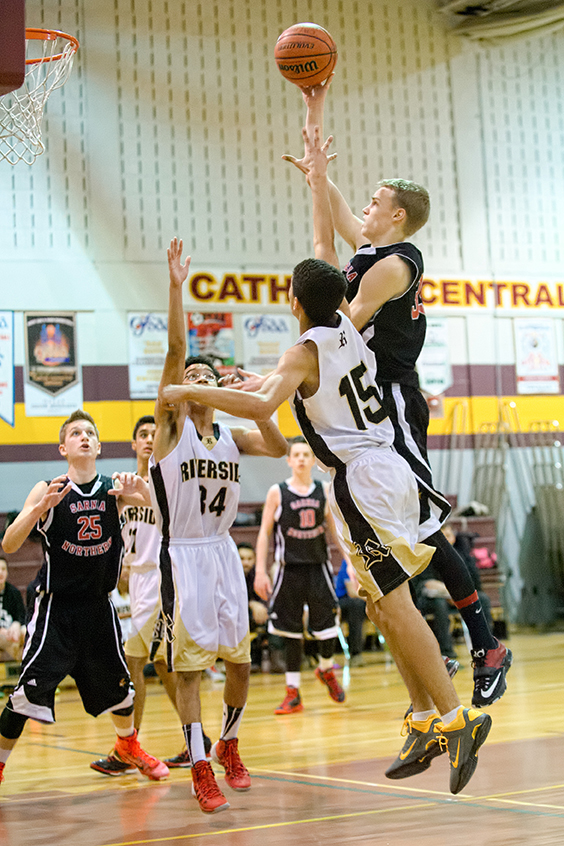 Luke Daichendt of the Northern Collegiate junior boys basketball team leaps high for a shot against Windsor Riverside during the Catholic Central Juniors Boys Basketball Tournament on Jan. 31.