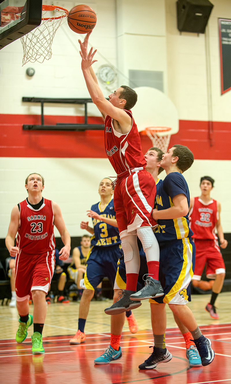 Northern Collegiate player Nathan Rome goes up for a basket against Chatham Kent on Jan. 10 during the Thrasher Invitational Tournament in Sarnia, which features eight senior boys basketball teams…