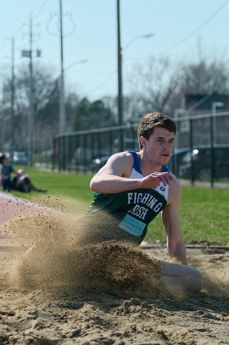 Cormac Brown of St. Patrick’s High School throws up a spray of sand nailing a Long Jump landing at a Lambton Secondary School Athletic Association track meet on April 17.…