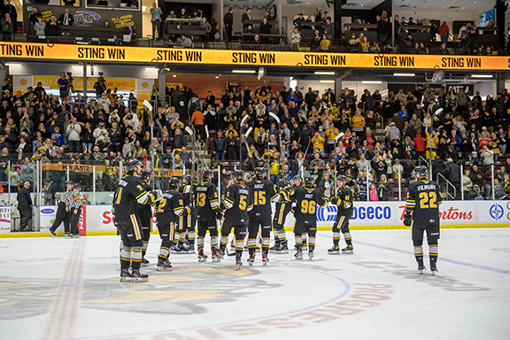 Journal staff The Sarnia Sting took a 2-0 series lead over the Guelph Storm in the first round of the Ontario Hockey League’s (OHL) Western Conference Quarter-Final series, Sunday afternoon.
