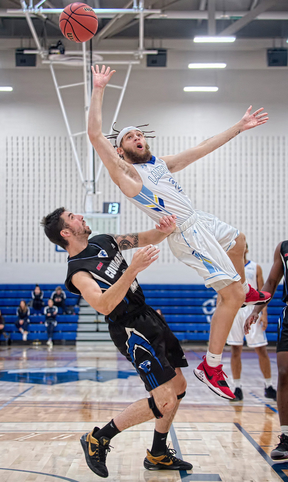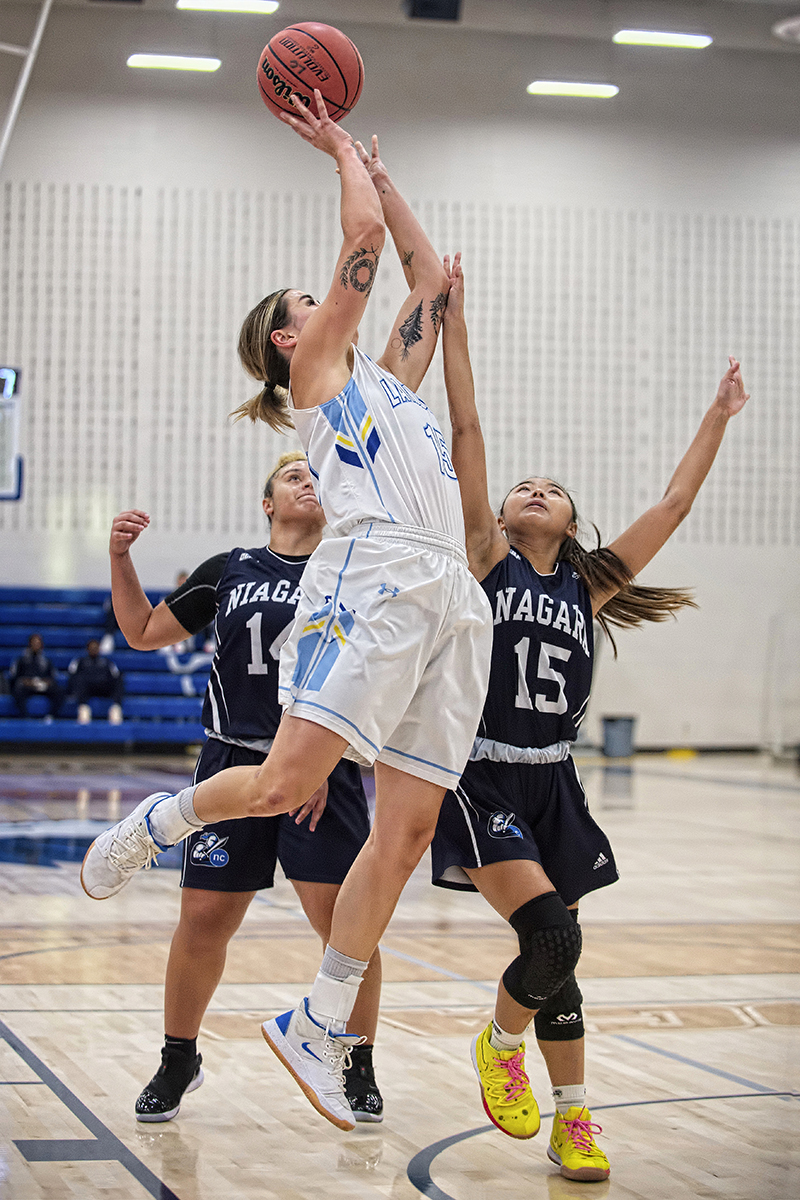Lambton Lion Tyrelle Miller is knocked off balance while attempting a shot against the Sault College Cougars in OCAA basketball action on Oct. 27. The Lions went on to defeat…