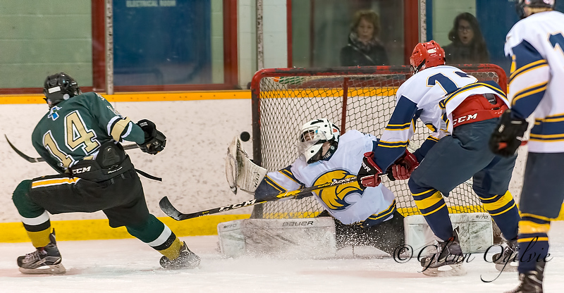 Leslie Brooks of St. Patrick's High School fires a shot at Chatham-Kent goalie Noah Legary during an LKSSAA hockey semi-final game last week at Clearwater Arena.