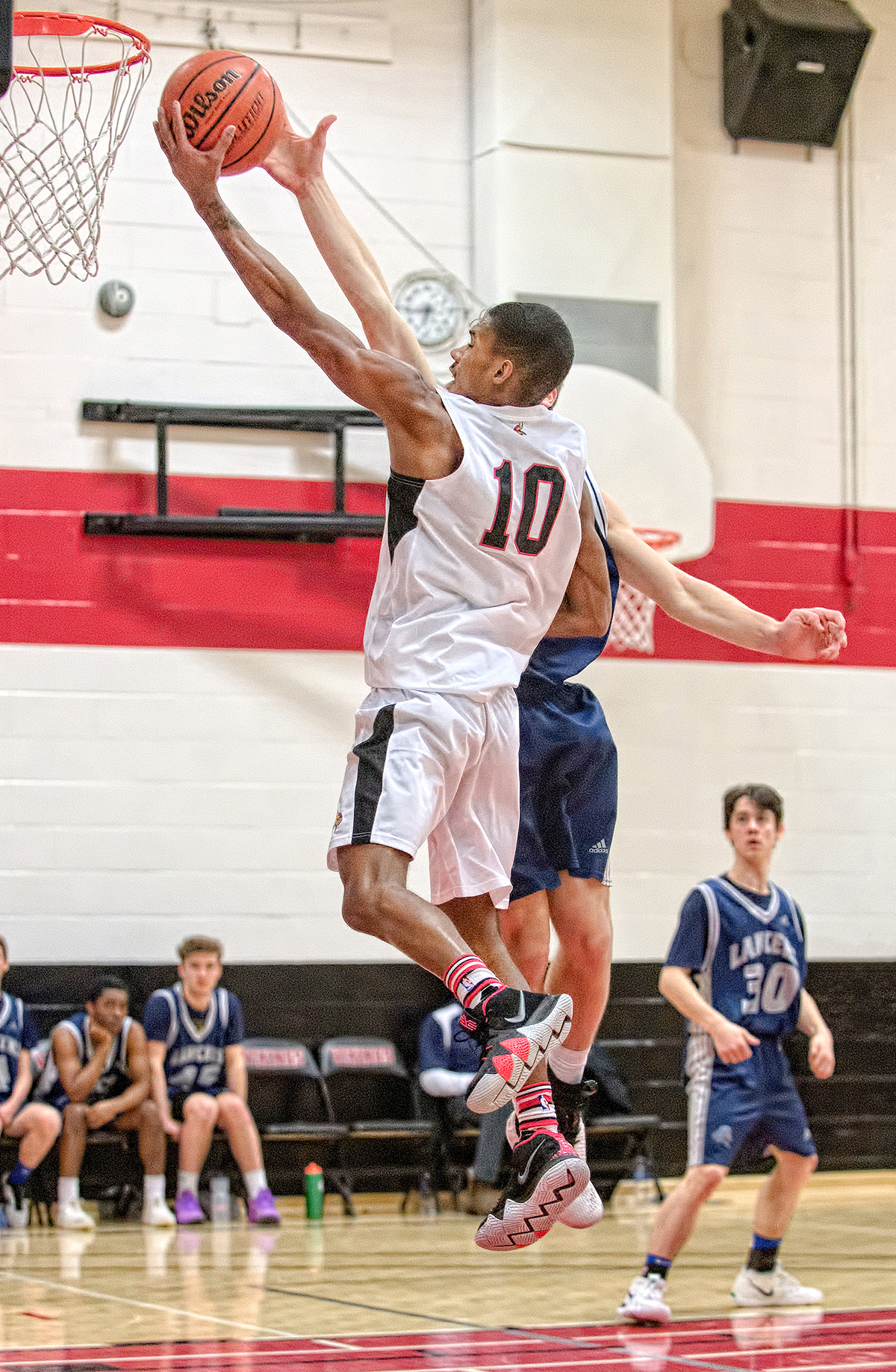 Jaden Orgorek (#10) scores two of his 23 points in leading Sarnia’s Northern Collegiate to its fourth straight Lambton-Kent high school basketball championship with a 68-50 win over Chatham’s Ursuline…
