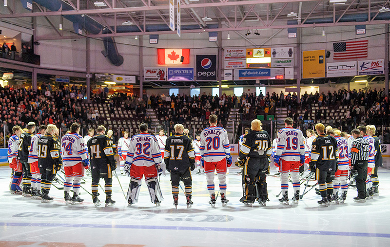 Players from the Sarnia Sting and Kitchener Rangers gather in a circle for a moment of silence to remember those killed in the Humboldt, Saskatchewan bus tragedy prior to their…